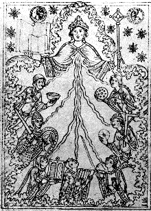 This print is German from about AD 1500. It shows a goddess holding a book and a rod. She is called Wisdom or Sophia. The love of wisdom or the "philio of Sophia" is the meaning of the word Philosophy. We see Wisdom’s lifeblood pouring into all of the arts and crafts drawn as young men. All knowledge is united in this illustration. Painters, architects, musicians, and soldiers receive Wisdom. Proverbs 9:1 says, "Wisdom hath built herself a house, she hath hewn her out seven pillars." Religious scholars have long speculated upon the seven pillars of Wisdom. Wisdom is poured out to seven vocations or callings. Wisdom also is seen presiding over branches of knowledge. This leads us to a second woodblock print, which also is German from about the same time. This one includes clear words representing the Seven Liberal Arts and Sciences. Once again a book and rod, symbols of a teacher, are held by a three-headed winged Wisdom. She oversees seven maidens.