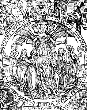 Parts of the original list date back to ancient Greece. By medieval times, the completed list had become central to educators and scholastics. The following remarkable woodblock print symbolically captures the relationship of knowledge to crafts.